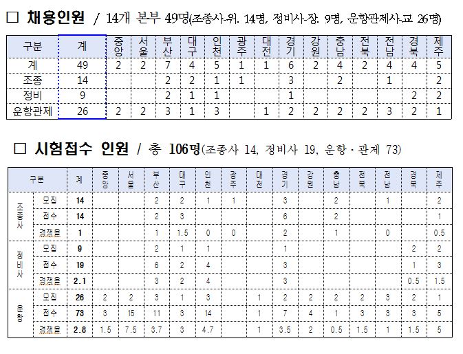 올해 채용인원은 헬기조종분야 14명, 헬기정비분야 9명, 운항·관제분야 26명 등 총 49명이다.