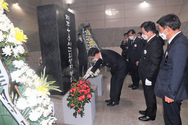 제73주년 제주4?3 추념식에서 전해철 장관과 원희룡 도지사가 헌화분향을 하고 있다 / 출처 = 제주특별자치도청