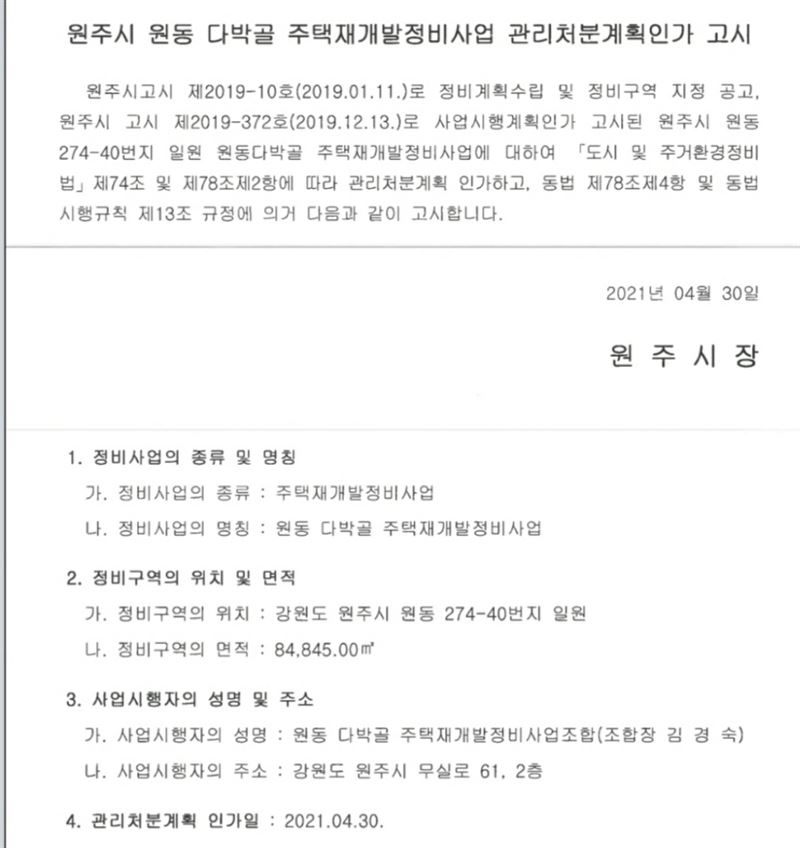 오늘 (30일) 원주시는 '원주시 원동 다박골 주택재개발정비사업 관리처분계획인가'를 고시했다.