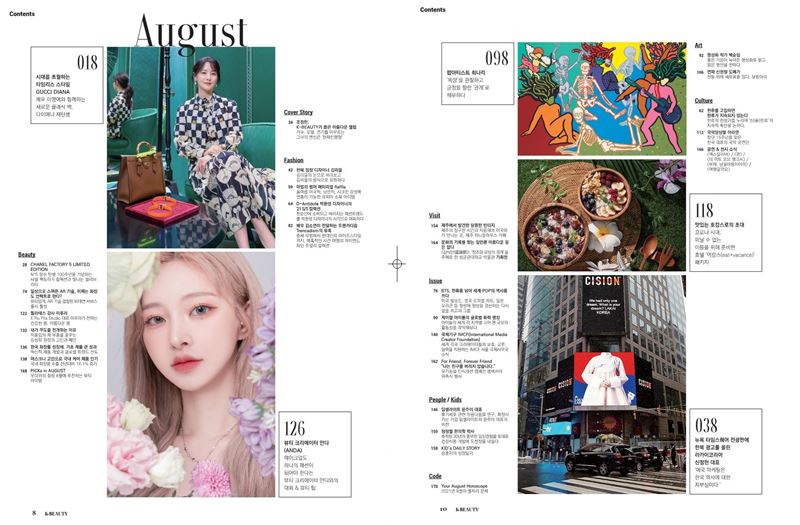‘K-BEAUTY’ 주요 내용은, 먼저 Beauty 이야기에서는 시대를 초월하는 타임리스 스타일 배우 이영애와 함께하는 GUCCI DIANA, N°5 탄생 100주년 기념 CHANEL, 뷰티업계의 AR기술, 필라테스 강사 이루라, 미용업 김성학 원장의 쿠도, 무더위 8월 추천 뷰티 아이템, 뷰티 크리에이터 안다의 뷰티 팁 등의 내용을 담았다.