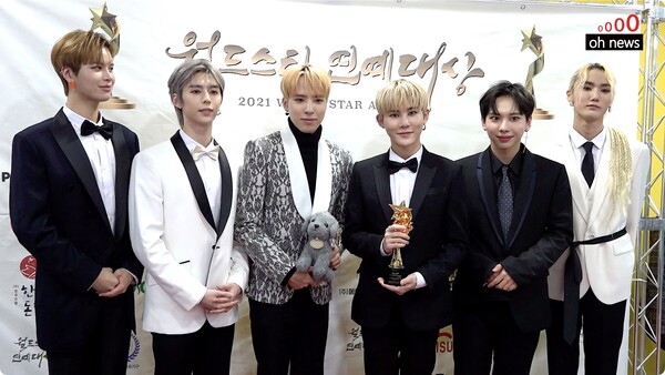 그룹 메가맥스가 21일 오후 경기도 고양시 일산동구 장항동 빛마루 방송지원센터에서 진행된 ‘2021 월드스타연예대상’ 시상식에 참석해 포즈를 취하고 있다.