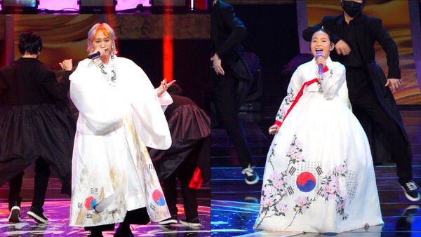트롯트와 힙합이 콜라보를 이룬 공연에서 김태연과 아퀴나스는 태극기가 새겨진 한복을 입고 나와 큰 호응을 받았다.