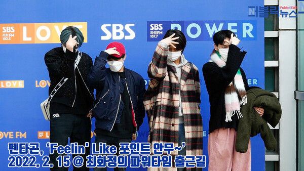 그룹 펜타곤의 키노, 우석, 홍석, 진호가 15일 오후 서울 양천구 목동 SBS에서 진행된 ‘최화정의 파워타임’ 생방송에 게스트로 참석하기 위해 출근을 하고 있다.