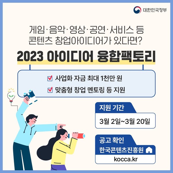 이전 기사보기 다음 기사보기 [정부지원정책] 게임·음악·영상·공연·서비스 등 콘텐츠 창업아이디어가 있다면? 바로가기 복사하기 스크롤 이동 상태바 알림 기자명 퍼블릭뉴스 글자크기 설정 가 가 기사의 본문 내용은 이 글자크기로 변경됩니다. [정부지원정책] 게임·음악·영상·공연·서비스 등 콘텐츠 창업아이디어가 있다면? 입력 2023.03.16 10:45 이 기사를 공유합니다 문화체육관광부 국민소통실 ‘2023 아이디어 융합팩토리’(~3.20) - 사업화 자금 최대 1천만원 - 맞춤형 창업 멘토링 등 지원 ☞ 공고 확인 : 한국콘텐츠진흥원(kocca.kr) 퍼블릭뉴스 news@psnews.co.kr 기자의 다른기사 저작권자 © 퍼블릭뉴스 무단전재 및 재배포 금지 개의 댓글 회원로그인 작성자 비밀번호 댓글 내용입력 댓글 정렬 최신순 추천순 답글순 BEST댓글 BEST 댓글 답글과 추천수를 합산하여 자동으로 노출됩니다. 닫기 더보기 댓글삭제 삭제한 댓글은 다시 복구할 수 없습니다. 그래도 삭제하시겠습니까? 비밀번호 댓글수정 댓글 수정은 작성 후 1분내에만 가능합니다. 본문 / 400 비밀번호 내 댓글 모음 닫기