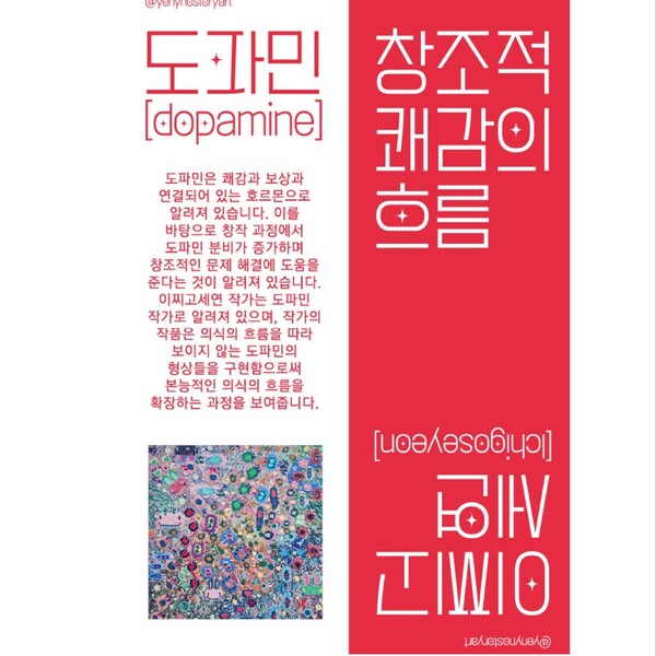 도파민은 쾌감과 보상과 연결되어 있는 호르몬으로, 창작 과정에서 도파민 분비가 증가하며 창조적인 문제 해결에 도움을 주는 것으로 널리 알려져 있다. 이찌고 세연(Ichigo se-yeon) 작가는 도파민 작가로서 잘 알려져 있으며, 그의 작품은 의식의 흐름을 따라 보이지 않는 도파민의 형상들을 구현함으로써 본능적인 의식의 흐름을 확장하는 과정을 보여준다.