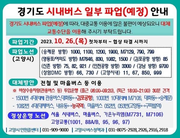 시에 따르면 10월 25일 노사 협상이 결렬될 경우 시내버스 23개 노선이 26일 첫 차부터 운행이 중단된다. 구체적인 노선은 △1000, 1100, 1200, 1900, M7129, 790, 799번(숭례문행) △M7646, 830, 1082, 1500번(영등포/여의도행) △75, 82, 921번(신촌/홍대행) △9700번(강남행), 85번(김포공항행), 3300번(인천공항행), 66, 730번(상암 DMC행) △11, 67, 850, 999번(일반 고양시내)이다.
