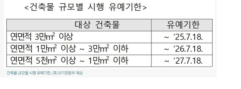 또한, 제도 시행에 대비한 건축물 관리주체들의 준비를 지원하기 위해 건축물의 규모에 따라 시행 유예기간을 차등 부여해 안정적인 제도 정착에 차질이 없도록 했다.