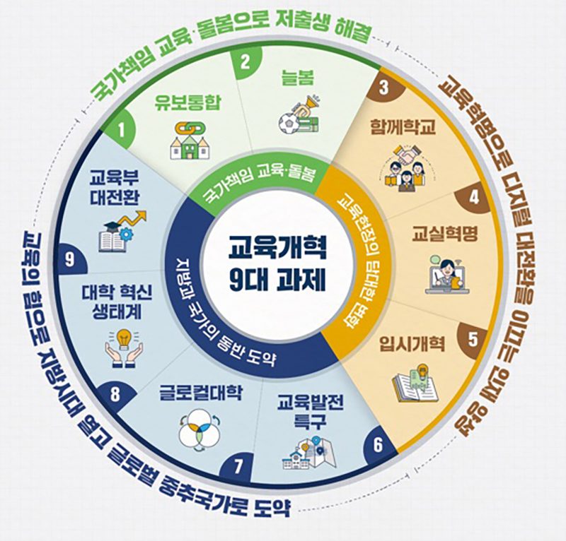 이에 교육부는 교육개혁을 통해 저출생 위기 대응, 교육의 과도한 경쟁 완화, 지역 성장동력 창출, 사교육 부담의 대폭 경감 등 사회 난제를 해결할 수 있는 실마리를 찾아 풀어가기 위한 정책을 추진하고 있다.