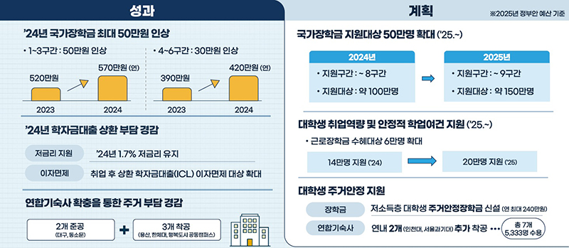 한편 내년부터는 정부 예산안 기준으로 국가장학금과 근로장학금 수혜 대상이 각각 약 150만 명(50만 명↑), 20만 명(6만 명↑)까지 확대되고, 저소득층 대학생 대상 월 최대 20만원을 지원하는 주거안정장학금도 신설해 더 많은 대학생이 부담을 덜 예정이다.