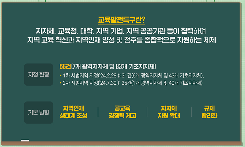 교육발전특구에서는 지자체와 교육청, 지역 대학, 산업체가 협력해 유아부터 초·중등, 대학까지 교육 전 단계에 걸쳐 지역 특성에 맞는 발전전략을 자율적으로 수립해 추진하고, 중앙정부는 특별법 발의 등 행·재정적 지원을 아끼지 않을 예정이다.