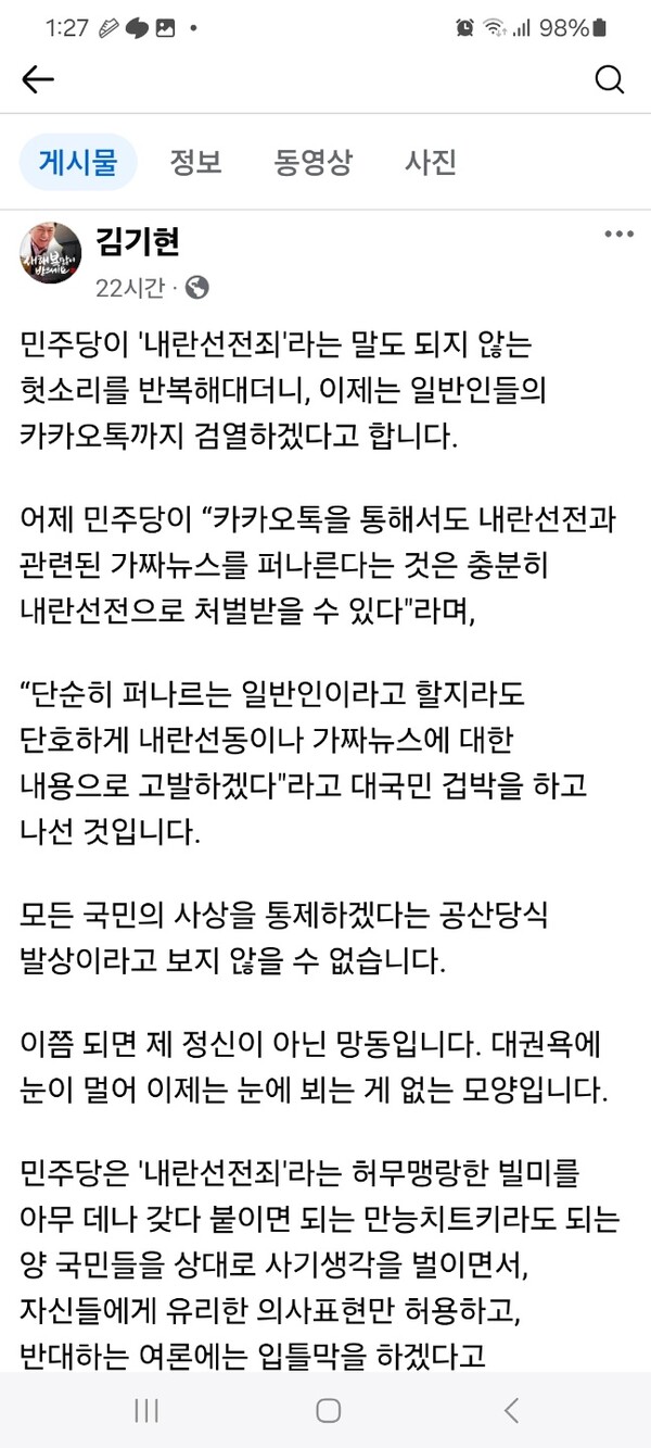 그는 민주당 정청래 법사위원장의 최근 발언을 소개했다. 정 의원은 "내란 동조, 방조, 선전선동도 징역 5년에 처하게 돼 있다. 비상계엄을 옹호하고 비상계엄 할 수밖에 없었던 논리를 펴는 것도 내란 선전선동 죄로 유죄에 처할 사안이다. 댓글로 내란을 옹호하는 자들도 공소시효 없는 것으로 아는데 캡처해서 처벌해야 한다”라고 말한 바 있다.