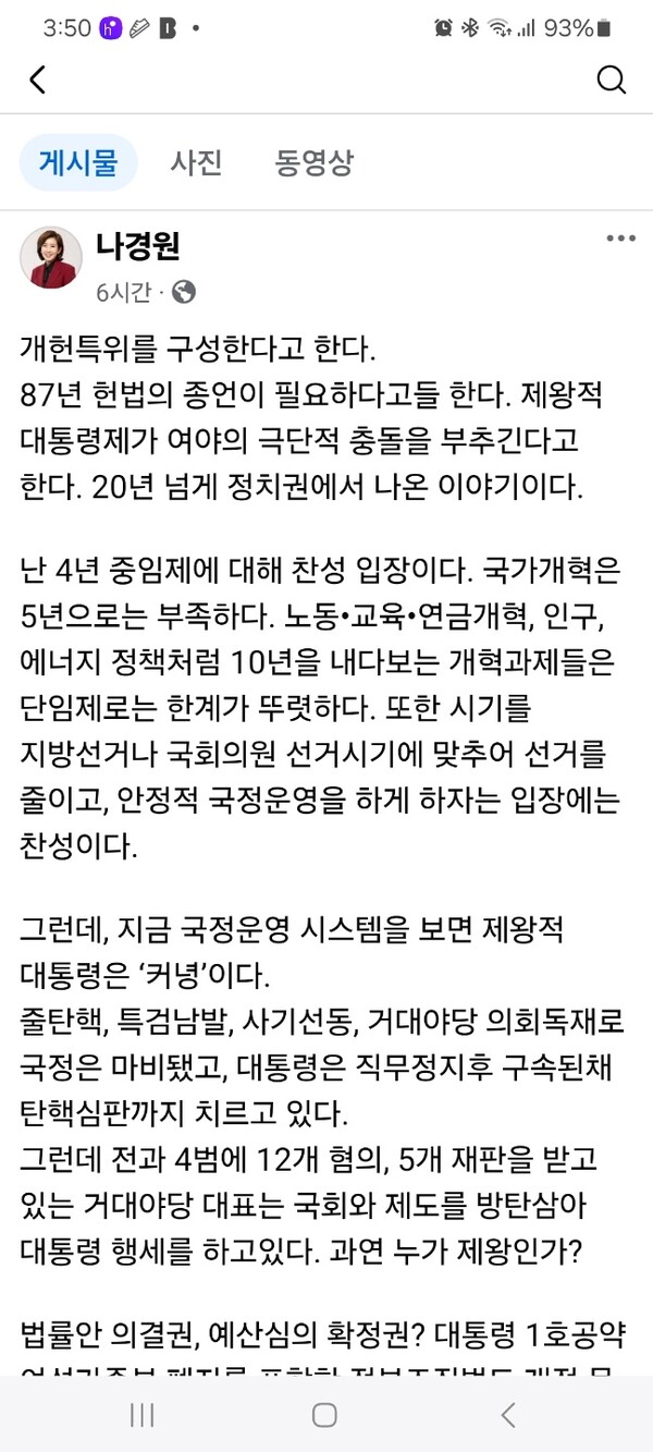 나 의원은 "그것이 개헌을 논의할 필수전제조건"이라며 "그것이 이재명대표의 우클릭의 진정성을 보여주는 것"이라고 단언했다.