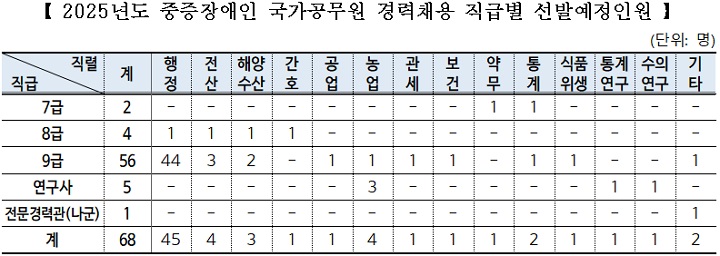 올해 중증장애인 국가공무원을 19개 중앙행정기관에서 행정, 전산, 농업 등 15개 분야에 걸쳐 다양한 직급으로 총 68명을 선발한다.