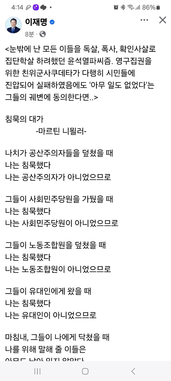 이 대표는 '아무것도 하지 않으면 아무도 남을 수 없다'는 의미를 지닌 시를 통해 지지자들에게 적극적인 행동으로 윤 대통령 파면에 나서달라고 촉구한 것으로 풀이된다.