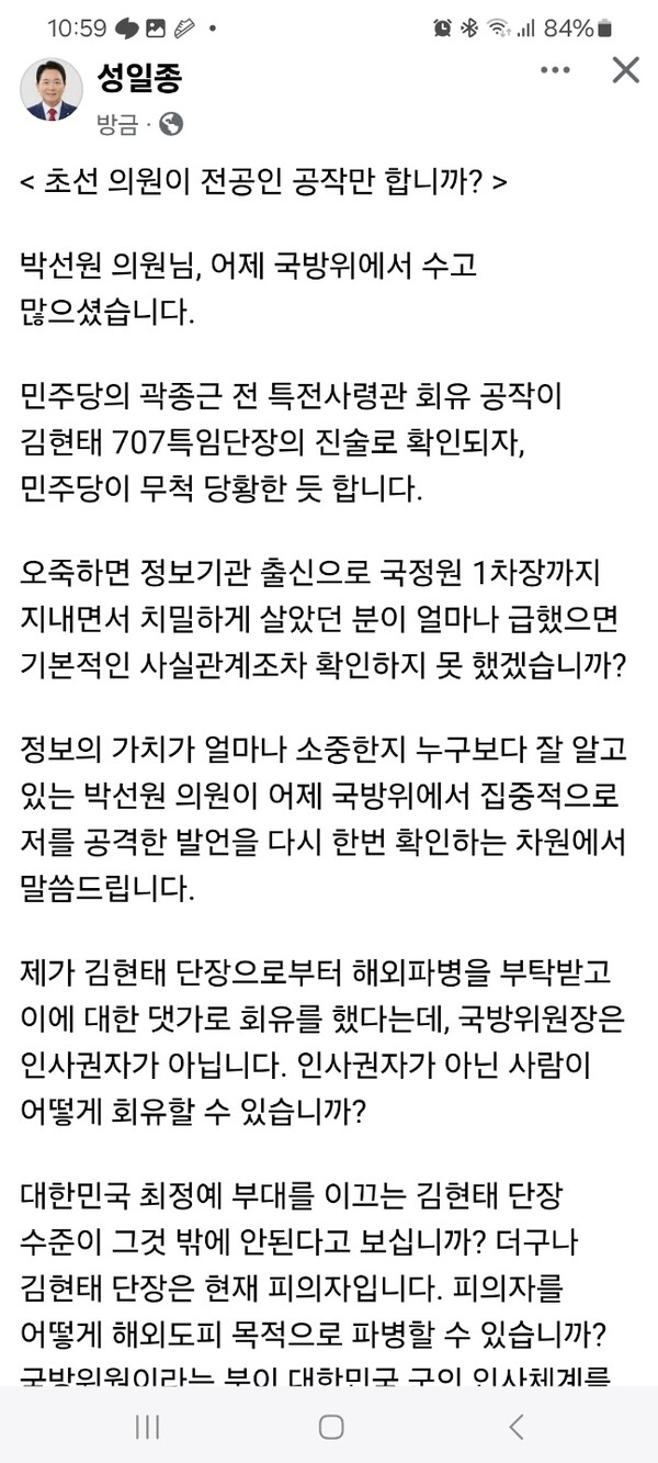 마지막으로 성 의원은 "이번 계엄 사태에서도 조기 탄핵을 목적으로 공작을 벌인 민주당의 민낯이 국민들에게 고스란히 노출되고 있다"며 "박선원 의원과 민주당은 국방위원장에 대한 정치 공작에 혈안이 될 게 아닐라, 탄핵공작부터 국민 앞에 사죄하길 촉구한다"며 글을 마쳤다.