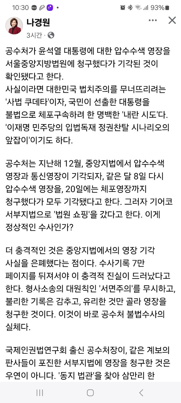 나 의원은 이날 저녁 페이스북 글을 통해 "공수처는 지난해 12월, 중앙지법에서 압수수색 영장과 통신영장이 기각되자, 같은 달 8일 다시 압수수색 영장을, 20일에는 체포영장까지 청구했다가 모두 기각됐다고 한다. 그러자 기어코 서부지법으로 '법원 쇼핑'을 갔다고 한다. 이게 정상적인 수사인가"라고 반문했다.