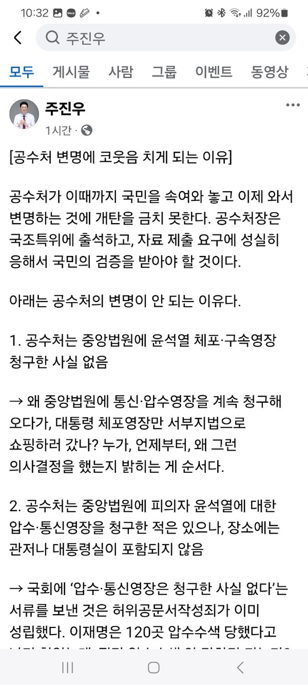 우선 '공수처는 중앙법원에 윤석열 체포·구속영장 청구한 사실 없음'과 관련, "왜 중앙법원에 통신·압수영장을 계속 청구해 오다가, 대통령 체포영장만 서부지법으로 쇼핑하러 갔나? 누가, 언제부터, 왜 그런 의사결정을 했는지 밝히는 게 순서"라고 밝혔다.