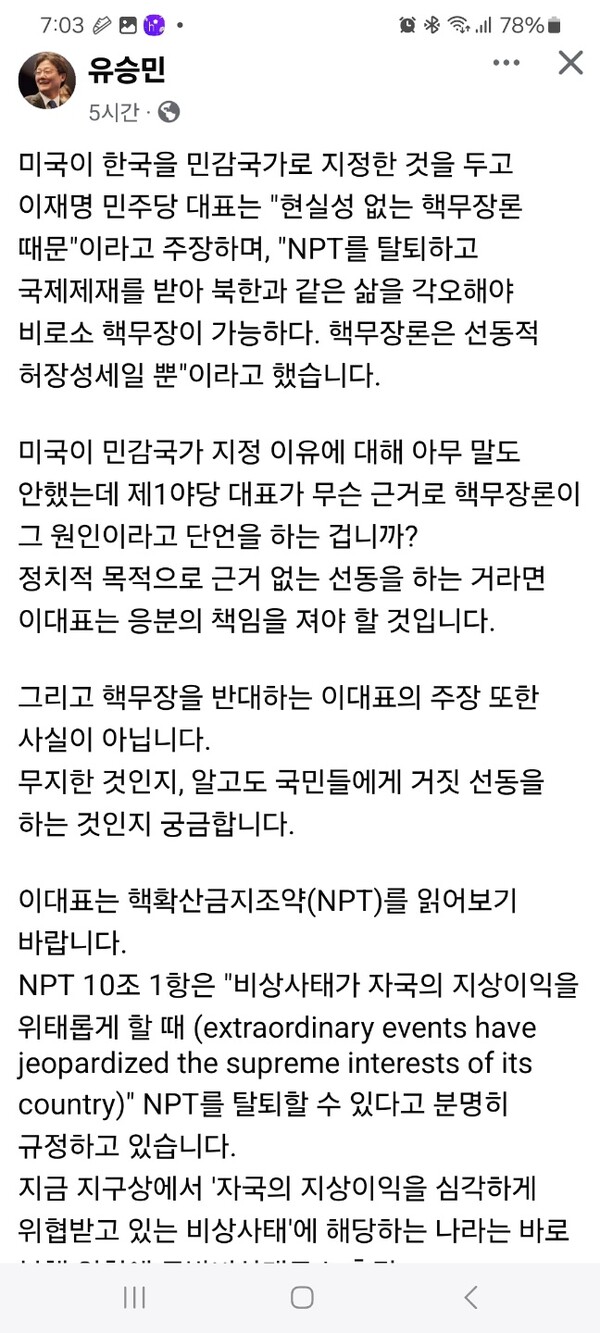 그러면서 "이 대표는 핵확산금지조약(NPT)을 읽어보길 바란다"며 "NPT 10조 1항은 '비상사태가 자국의 지상이익을 위태롭게 할 때' NPT를 탈퇴할 수 있다고 분명히 규정하고 있다"고 설명했다.