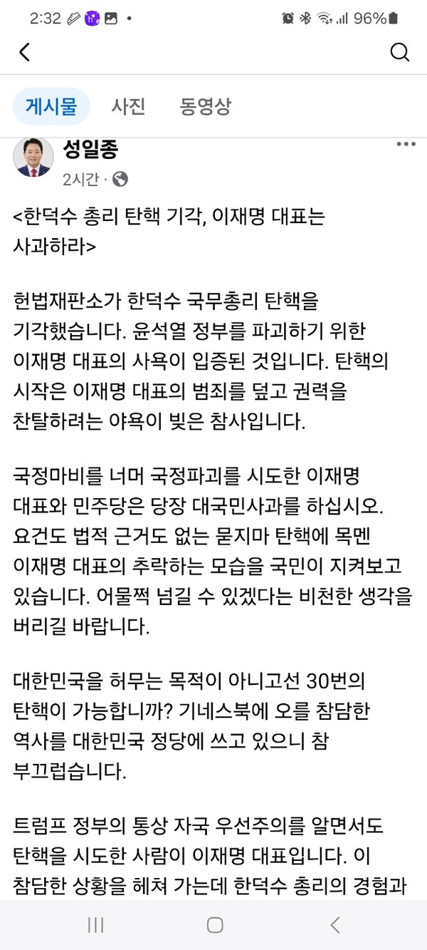 성일종 국민의힘 의원은 이날 페이스북 글을 통해 헌재의 탄핵 기각 결정과 관련, "윤석열 정부를 파괴하기 위한 이재명 대표의 사욕이 입증된 것"이라며 "탄핵의 시작은 이재명 대표의 범죄를 덮고 권력을 찬탈하려는 야욕이 빚은 참사"라고 단언했다.