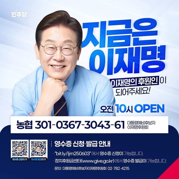 그는 대통령예비후보자 이재명 후원회 명의의 농협 후원계좌를 첨부하면서 정치후원금 영수증 신청 및 발급 안내 방법도 제시했다.