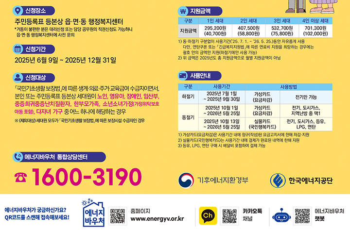 한편 대상자는 먼저 행정복지센터에서 신청·접수하면 시군구에서 선정한 후 결정통지를 발송해 카드사·에너지공급자 등에서 바우처를 발급·사용할 수 있다.